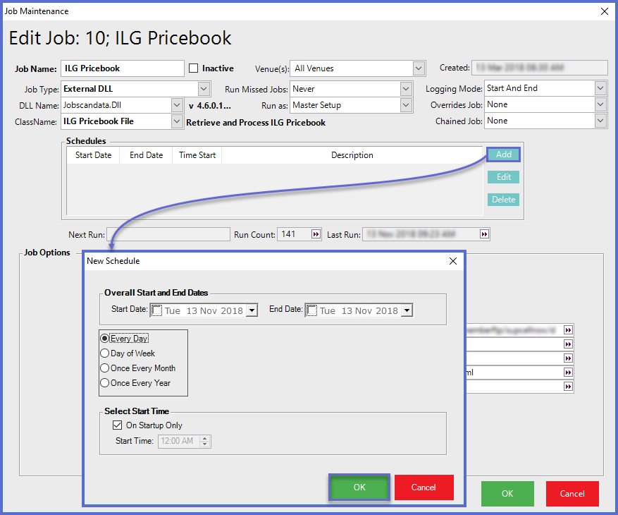 - For Price Book Jobs, it's recommended to check for the Monthly Pricebook daily so scheduling the Job to run every day at a specific time or at Startup is suggested