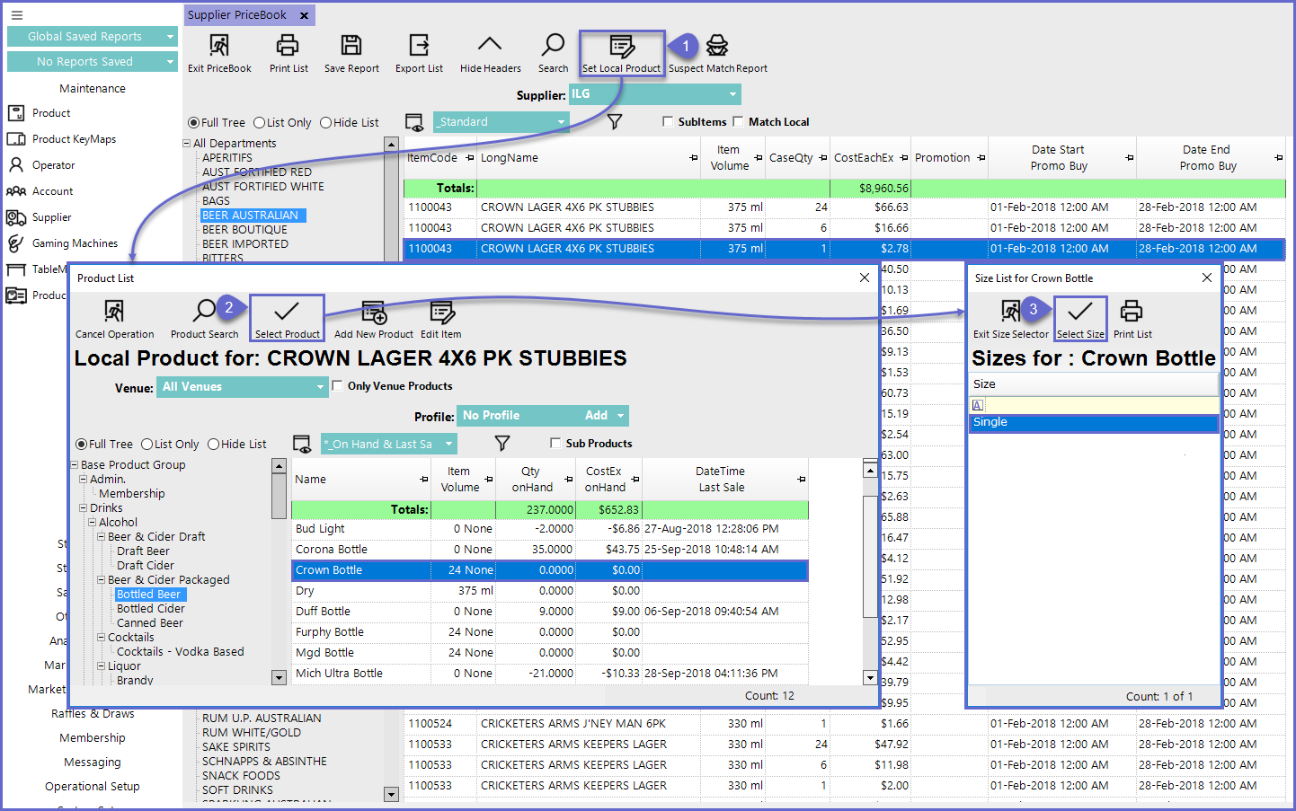 - If Products from the Pricebook are not matched/linked with Products in the Database they can be linked manually using the Set Local Product button