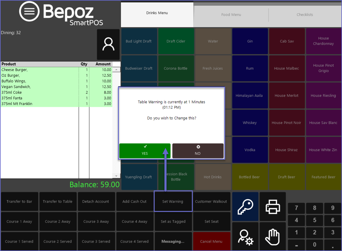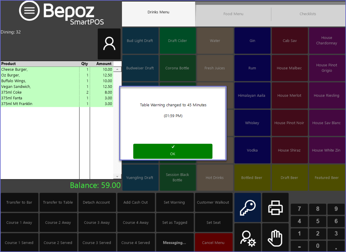 The Warning function can be used to help with Table Turnover or to help as a reminder for Waitstaff to check with the kitchen and speed up ticket times.