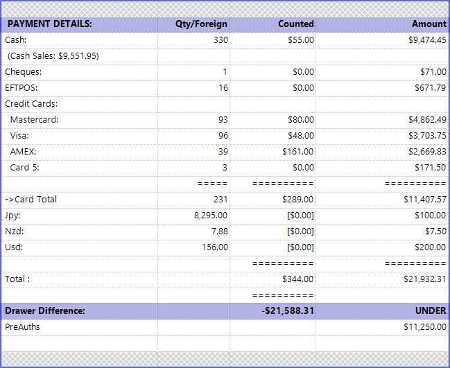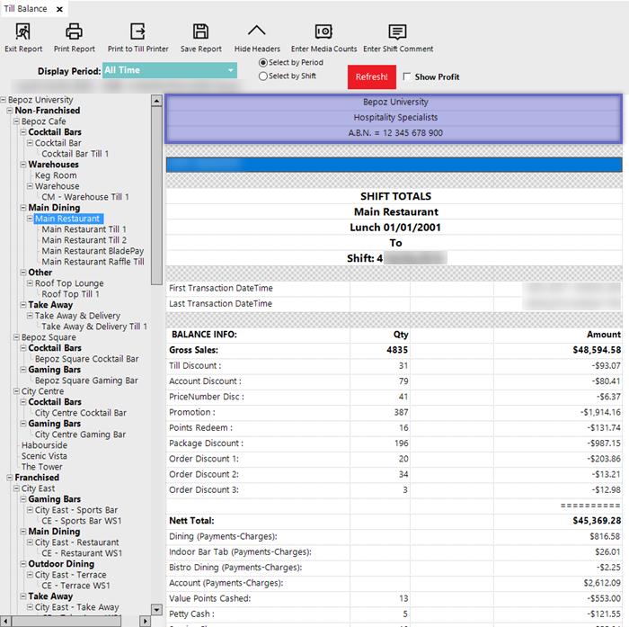 A Till Balance Report allows Operators to balance the Expected Total amounts in the System with the Actual Total amounts counted in the Till.
