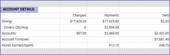 - If the Account Members are also subjected to the promotional points system, this section displays the Points Earned, Spent and Redeemed by Account Members in different rows