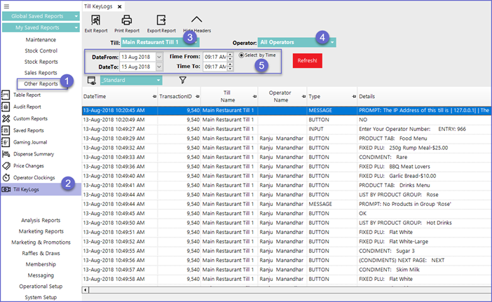 The Keylogs Report is simple in that it does not have many functions but simply shows which Till button was clicked when.