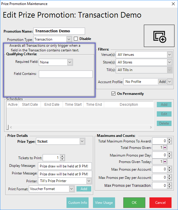 - This will Award a Prize with every Transaction or as determined by the Required Field and Field Contains configurations