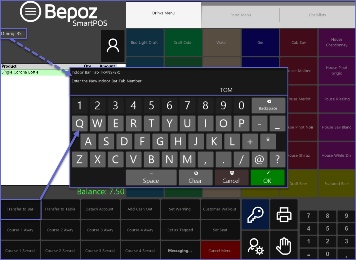 - A Table Account must be Saved prior to Transferring, otherwise, the Operator will receive a warning prompt