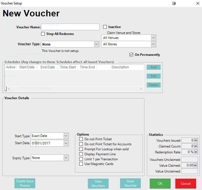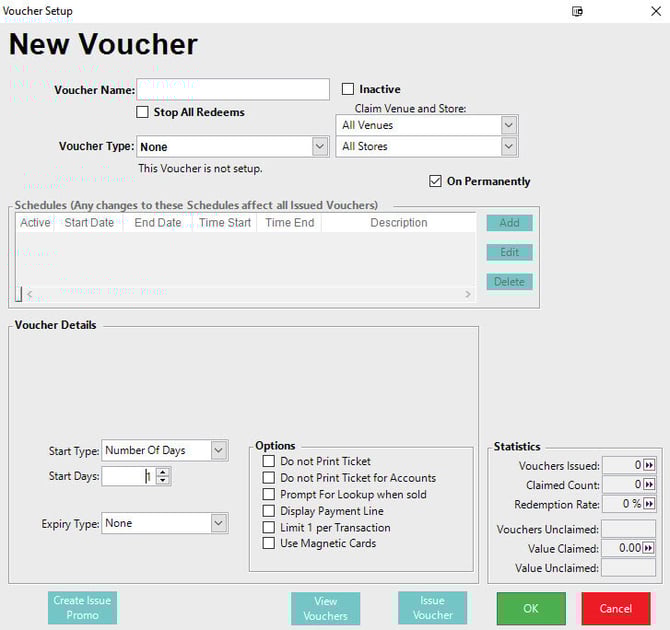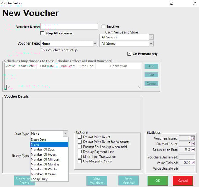 - Setting a Start Type can be useful when a fix schedule is not applicable but you would like to have control over when a Voucher can be redeemed this will commonly be used when issuing vouchers from SmartPOS or via the API