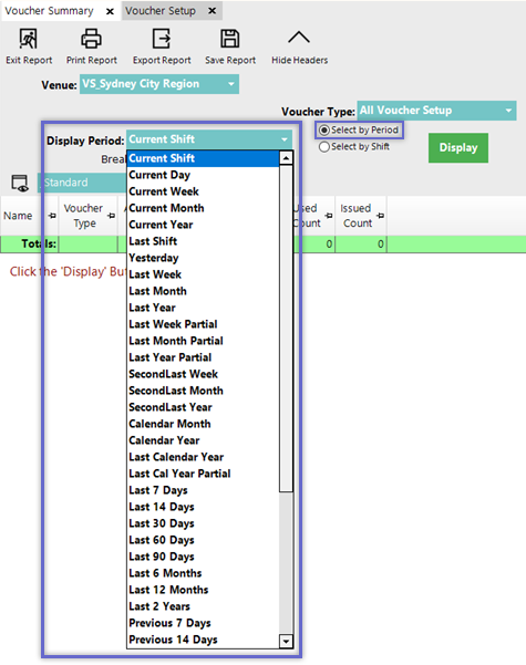 When the Select by Period radial is selected - as opposed to the Select by Shift radial - the Reporting Period option will be a Display Period drop-down offering the standard BackOffice options of available Periods With the Select by Period option chosen, select the desired Display Period for Reporting |