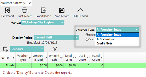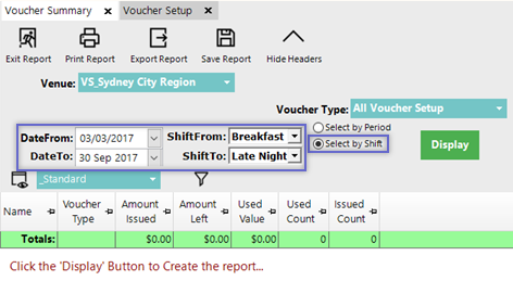 After selecting from the Reporting options (Venue and Voucher Type), the report will display the monetary value issued and can be compared to the amount left to be redeemed.