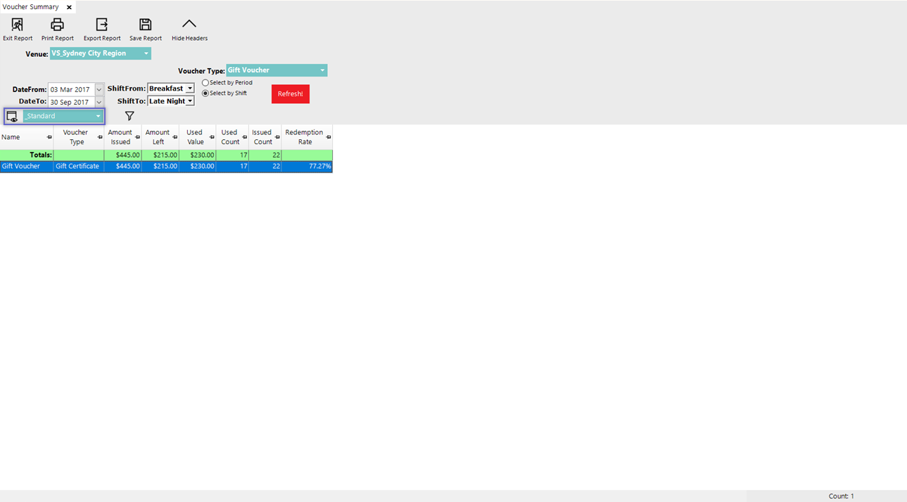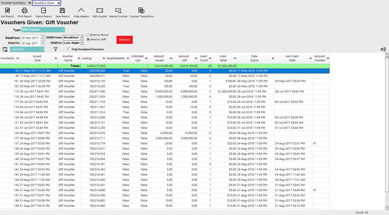 - Amount Left which is the total monetary value that has not yet been redeemed of all of the Vouchers issued for that Voucher Name over the set Reporting Period