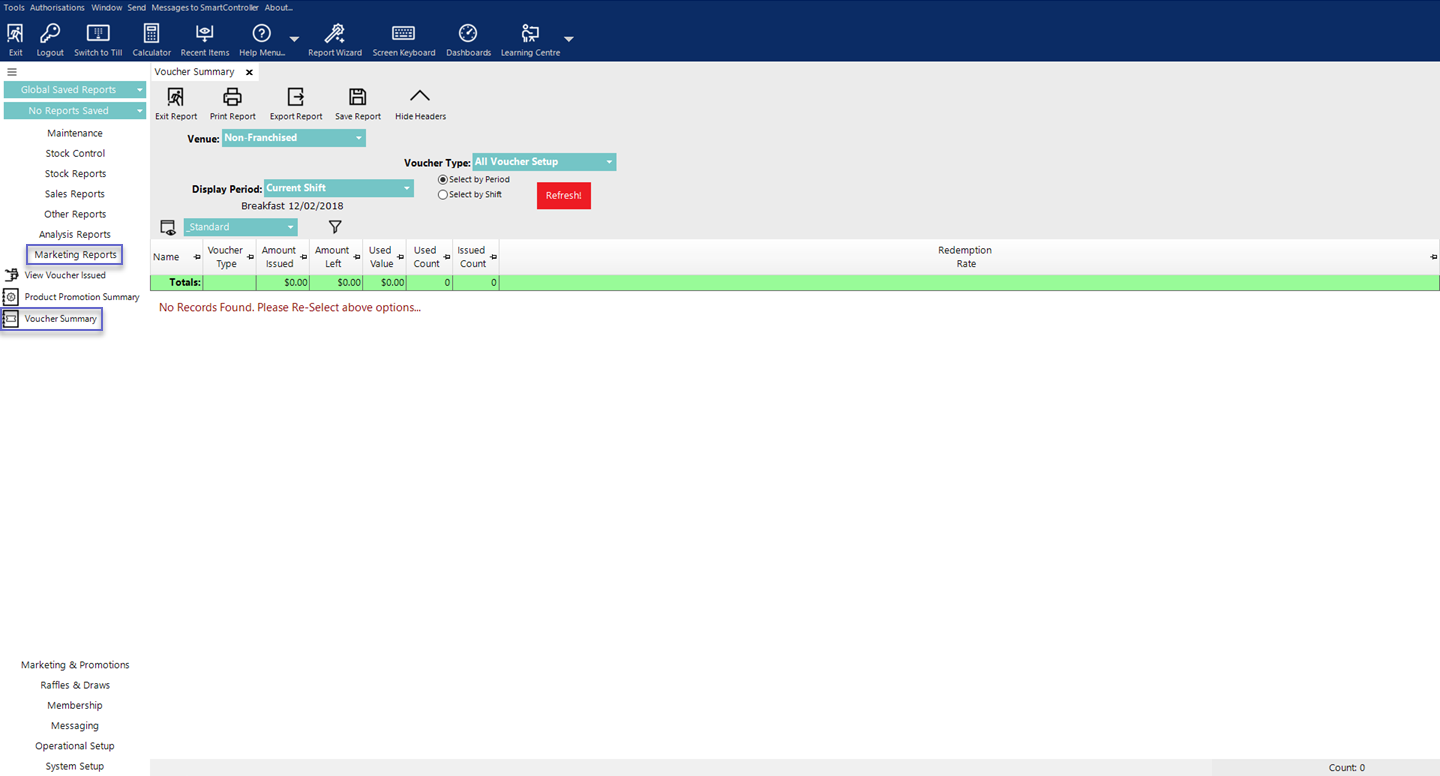 - After expanding the Marketing Reports menu, the Voucher Summary will be available for selection