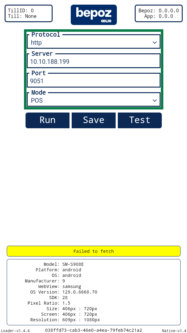 Note: Each EFTPOS device must use its own matched SmartAPI port number (Port), and must match the API Host IP address (Server). If the device is configured incorrectly, it will display "Failed to fetch" as shown in the image above.