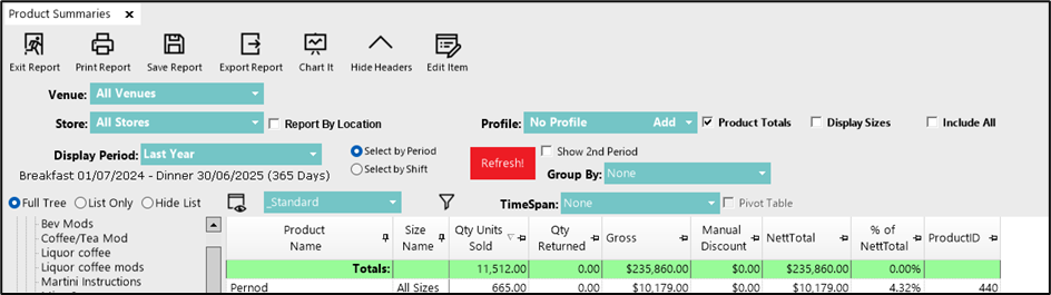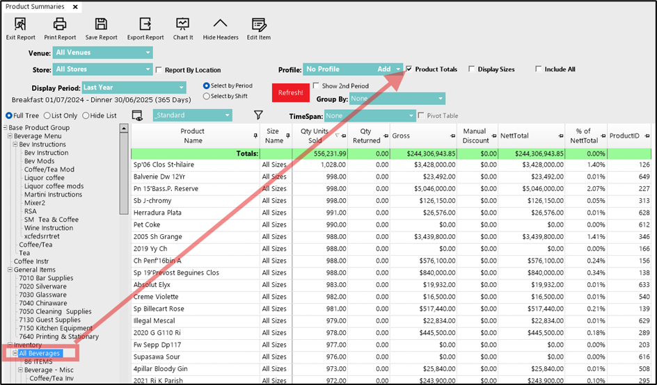 Note* If selecting a top-level group like 'All Beverages', you need to flag on Product                     Totals. This will break down the sub-groups into a list of products alphabetically.