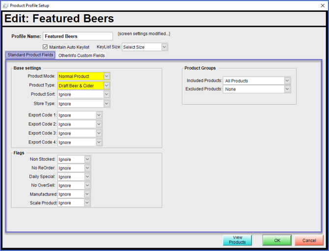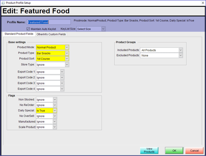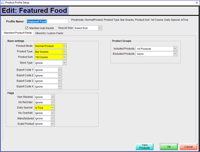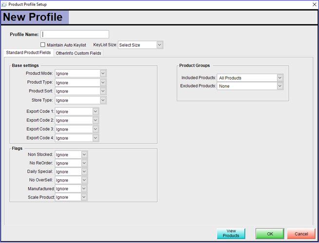 - The Fields and Flags within the Product Profile Setup window will set the configuration for the Product Profile; these will be explained in detail below
