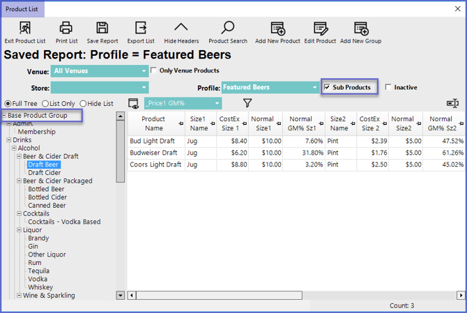 To make sure that all the available products are visible, select Base Product Group and enable the Sub Products Flag
