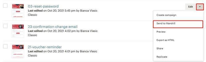 To send a template to Mandrill, click on the "down arrow" and click "Send to Mandrill" as shown below.