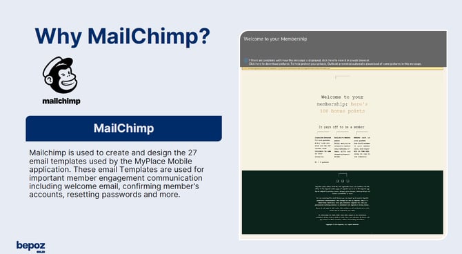Mailchimp is used to create and manage the email templates used by the MyPlace mobile application. These templates support important member communications such as welcome emails, account confirmations, password resets, and other engagement emails.
