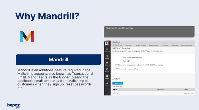 Mandrill, also known as Mailchimp Transactional Email, is the service that sends those emails. It works with Mailchimp to trigger and deliver the correct template when actions such as member sign-up, password resets, and other account-related events occur.