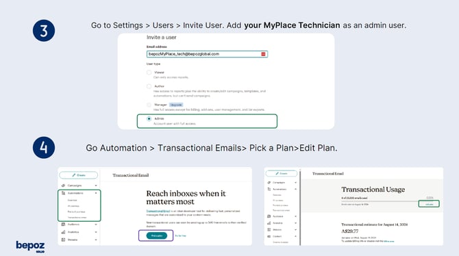 Go to Settings > Users > Invite User. Add your MyPlace Integration Technician as an Admin user.
