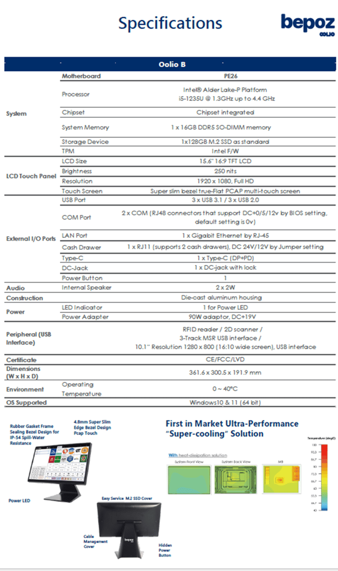 The Oolio B is an all-in-one point-of-sale (POS) terminal designed for hospitality and retail environments running bepoz. This model features an Intel Core i5 processor for higher performance while retaining the same compact form factor and support for common POS peripherals such as a customer display, scanners, RFID, MSR, and cash drawer.