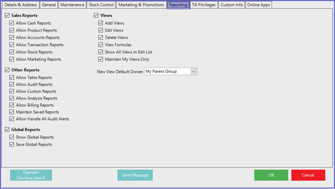 This tab contains a number of privilege flags relating to Reporting and Views in BackOffice and is broken down into the following sections: Sales Reports, Other Reports, Global Reports, and Views.