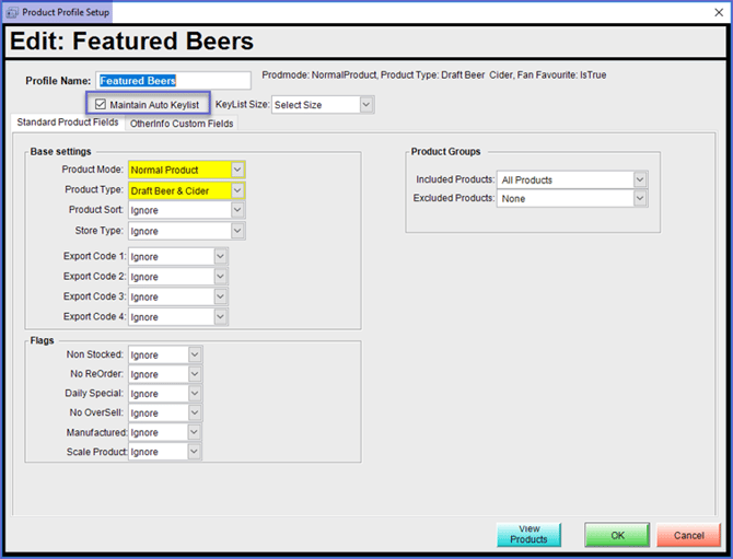 - By returning to the Product Profile Setup, and changing the parameters, the qualifying Products will dynamically change within the Keylist, therefore at the SmartPOS Workstation/s