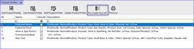 - After clicking the Re-create KeyList Button in the Header Section of the Product Profiles Tab, SmartPOS will only display the Products which meet these new Parameters