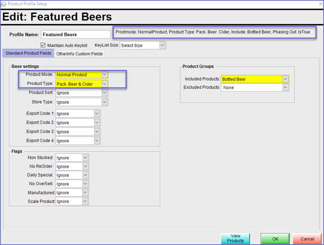 - For example, the parameters can be changed to Product Mode of Normal Product, Product Type of Pack. Beer & Cider, and Phasing Out flag enabled