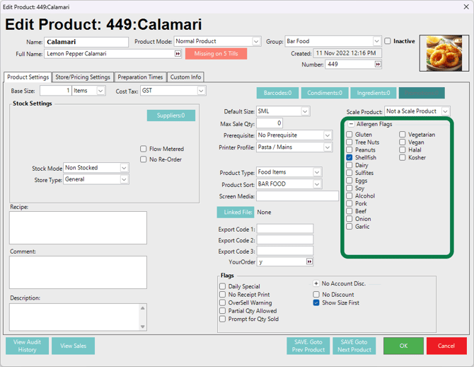 Tip: Allergen Flags may also be applied to Products modifiers/condiments if required by the venue.