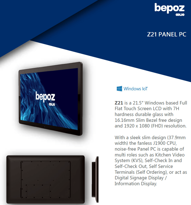 The Z21 AIO Panel PC is a 21.5" Windows-based, fanless touchscreen device commonly used in bepoz deployments for customer-facing or operational displays, including kiosks and kitchen video workflows.